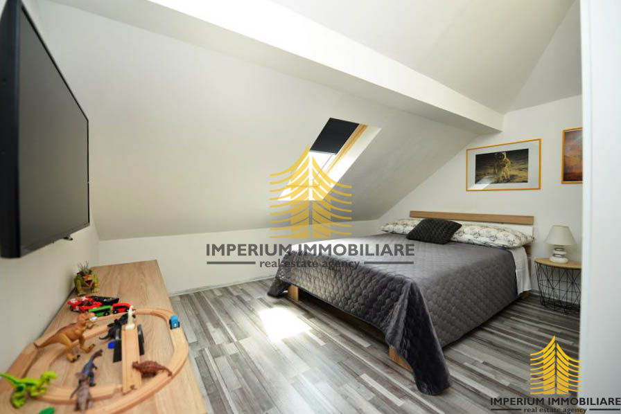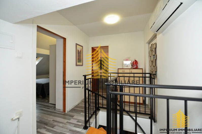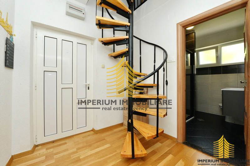 Stan se sastoji od prostranog dnevnog boravka, blagovaonice s kuhinjom, dva balkona s prekrasnim pogledom, tri spavaće sobe, kupaonice s WC-om te dodatnih prostorija na potkrovlju. Podovi su obloženi parketom i keramikom na prvoj etaži, dok su na gornjoj etaži obloženi laminatom.
