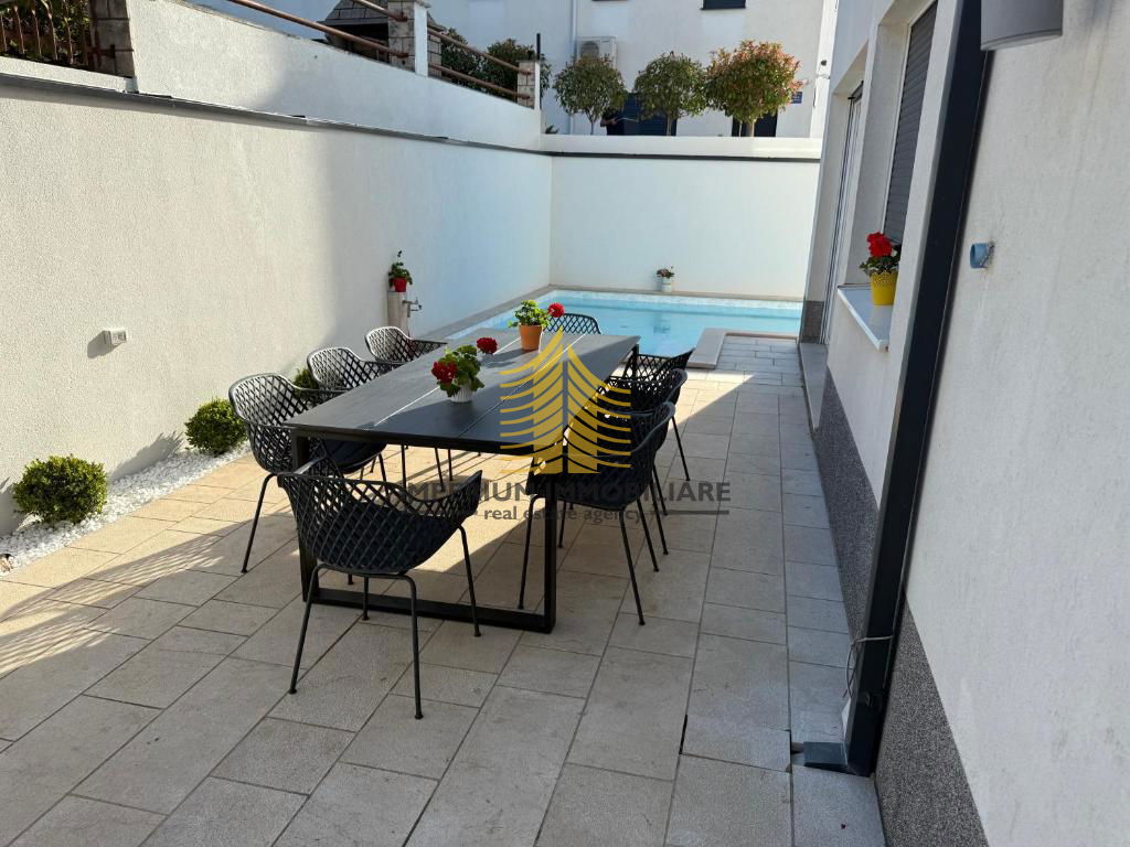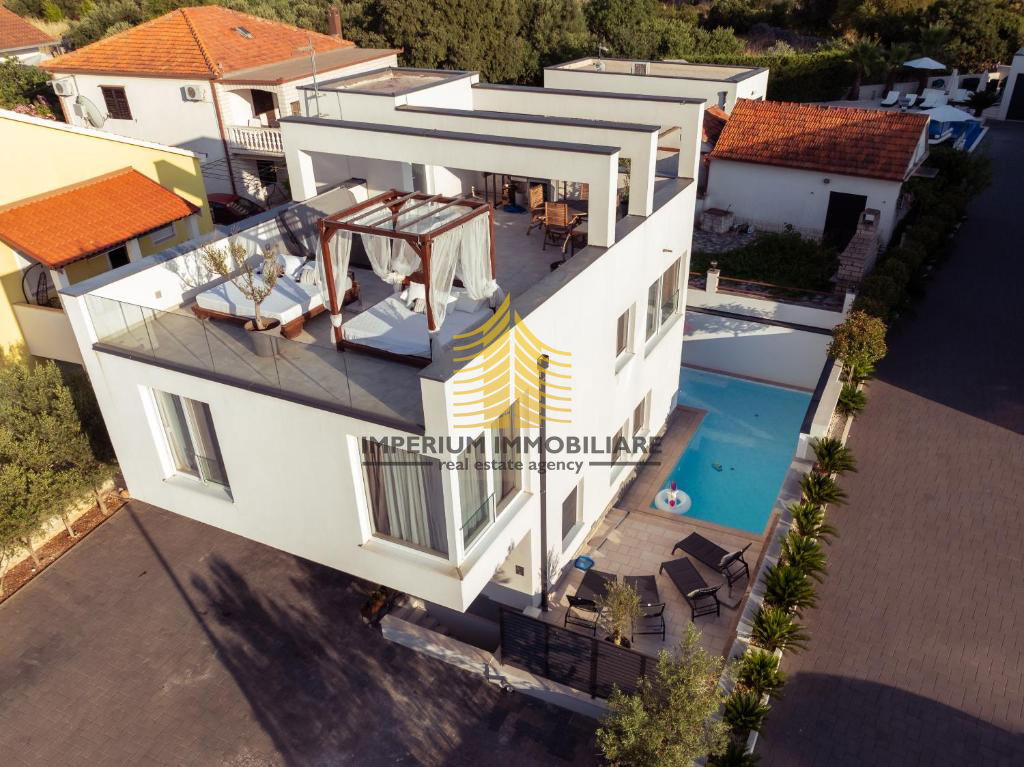 Na prodaju je samostojeća kuća površine 200 m2, izgrađena 2024. godine, smještena u Okrugu Gornjem na atraktivnoj lokaciji otoka. Ova suvremena nekretnina ističe se elegantnim dizajnom i pažljivo uređenim okolišem na parceli veličine 391 m2, pružajući izniman ugođaj privatnosti i mira.