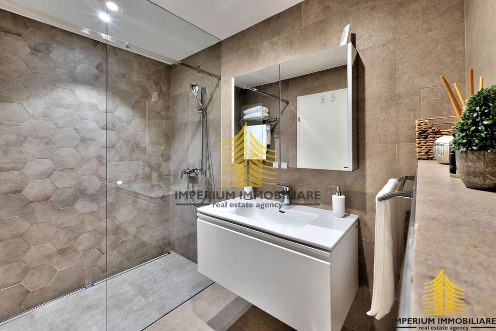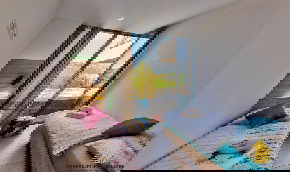 Na prvom katu je glavna spavaća soba s vlastitom kupaonicom, dječja soba i još jedna spavaća soba s bračnim krevetom. Tu su i dodatna kupaonica te WC sa svim potrebnim sadržajem. Sve spavaće sobe imaju pogled na more i pristup drvenoj terasi opremljenoj hidromasažnom kadom za šest osoba, ležaljkama i vanjskim sjedećim prostorom.