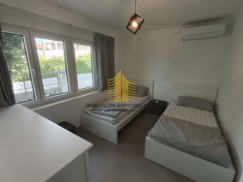 Stan se nalazi na mirnoj lokaciji te obiluje prirodnom svjetlošću, što dodatno doprinosi ugodnoj atmosferi. Ima dvije spavaće sobe, što osigurava dovoljno privatnosti i komfora za obitelj ili parove. Dnevni boravak je prostran i povezan s balkonom, omogućujući uživanje na otvorenom prostoru. Uređena okućnica dodatno podiže kvalitetu boravka i pruža prostor za opuštanje.