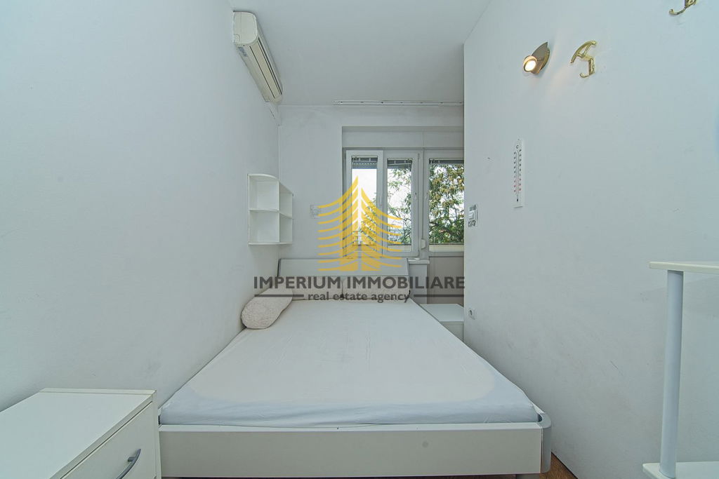 Namješten je i potpuno opremljen – uključuje kuhinju s aparatima, perilicu rublja, krevet i TV. Grijanje je centralno, a dodatnu udobnost pruža klima uređaj.